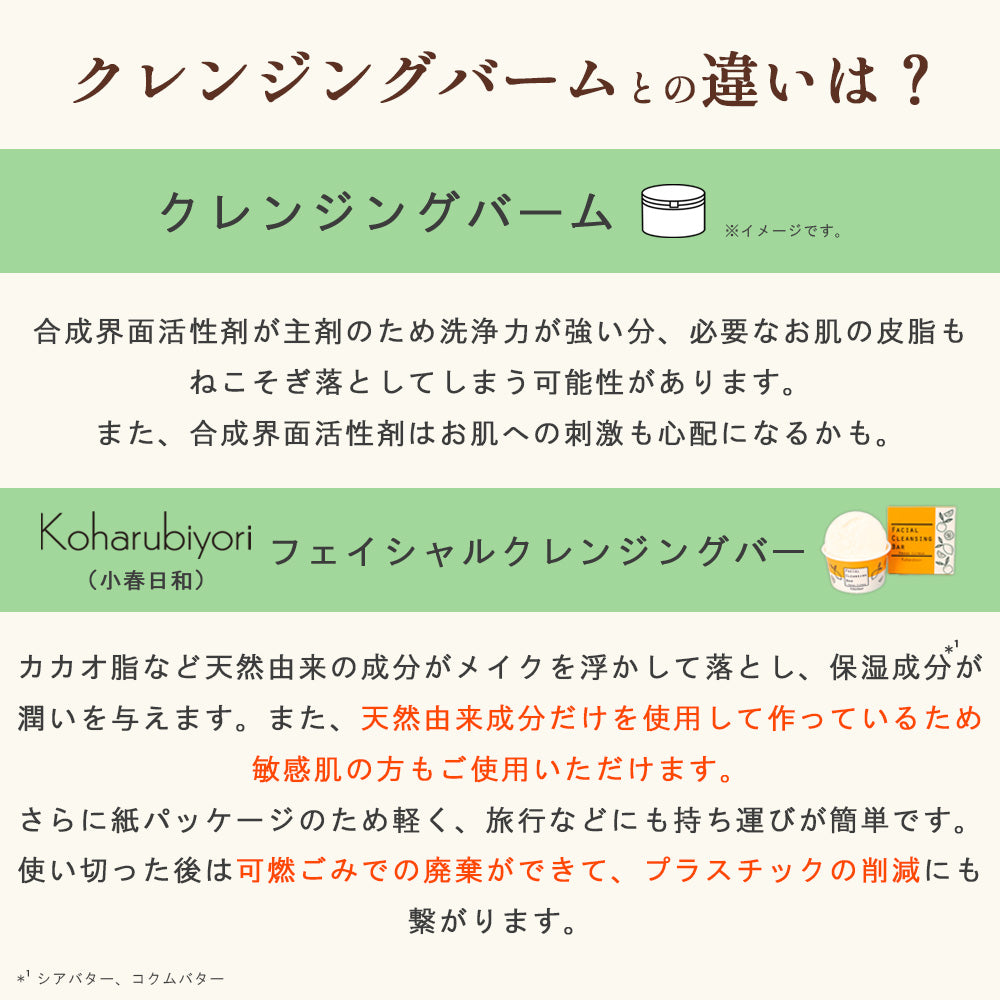 | 使用方法 | ①容器からフェイシャルクレンジングバーを取り出し、ぬるま湯または水で濡らし、こすって溶かしながら手のひらにローションを作ります。 ②ローションを肌に優しくなじませ、マッサージしながらメイクや汚れを浮き上がらせます。汚れが気になる所には多めのローションを重点的になじませてください。仕上げに流水で洗い流します。 |