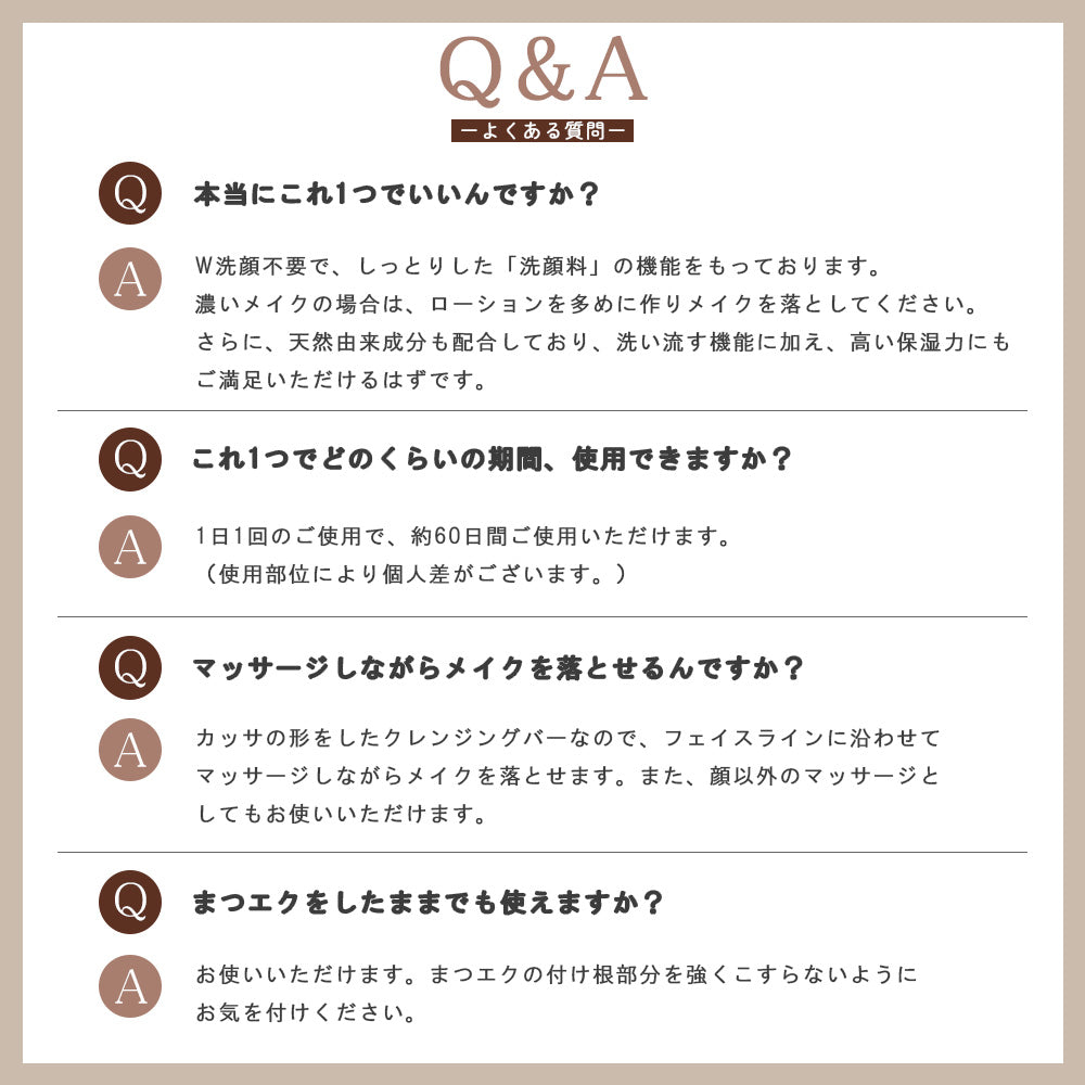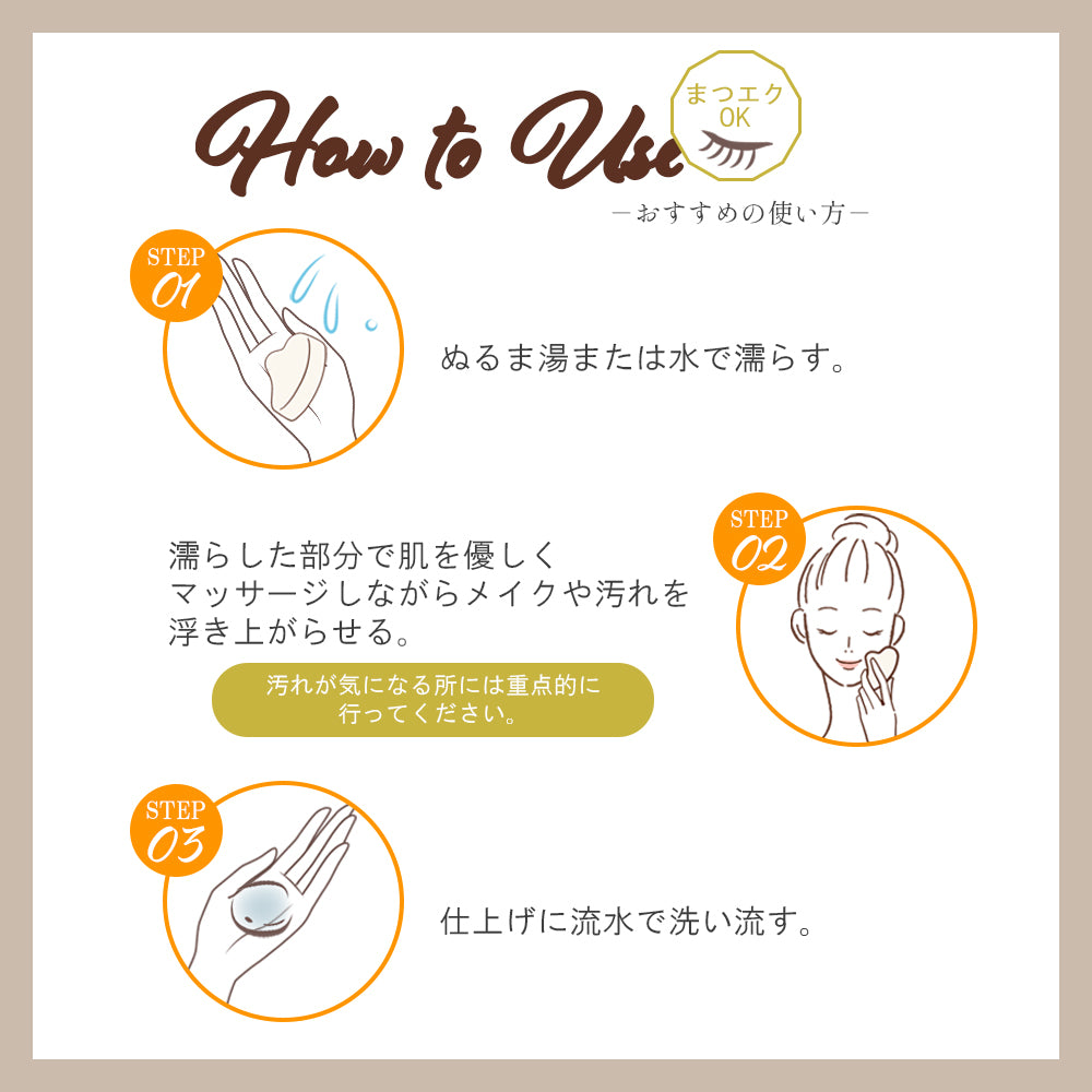 | 使用方法 |  フェイシャルクレンジングバーを、ぬるま湯または水で濡らし、その部分で肌を優しくマッサージしながら、汚れを浮き上がらせます。 ※顔をあらかじめ濡らしておく必要はありません。体温で溶ける成分がメイクや汚れを溶かしながら肌から浮き上がらせます。 |