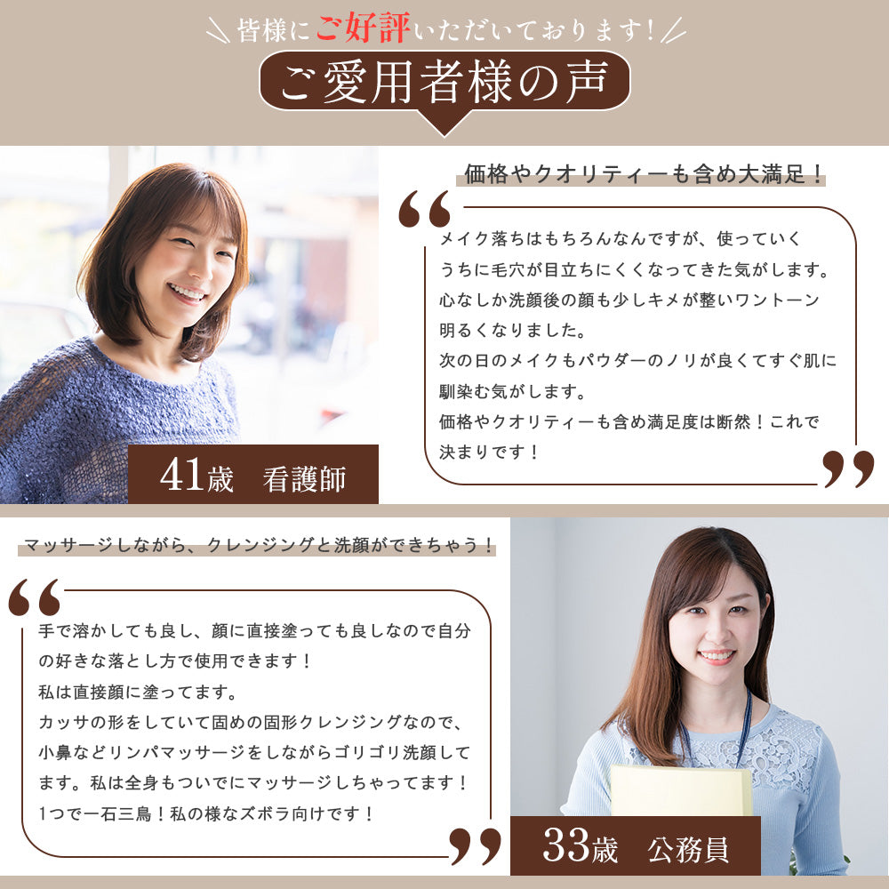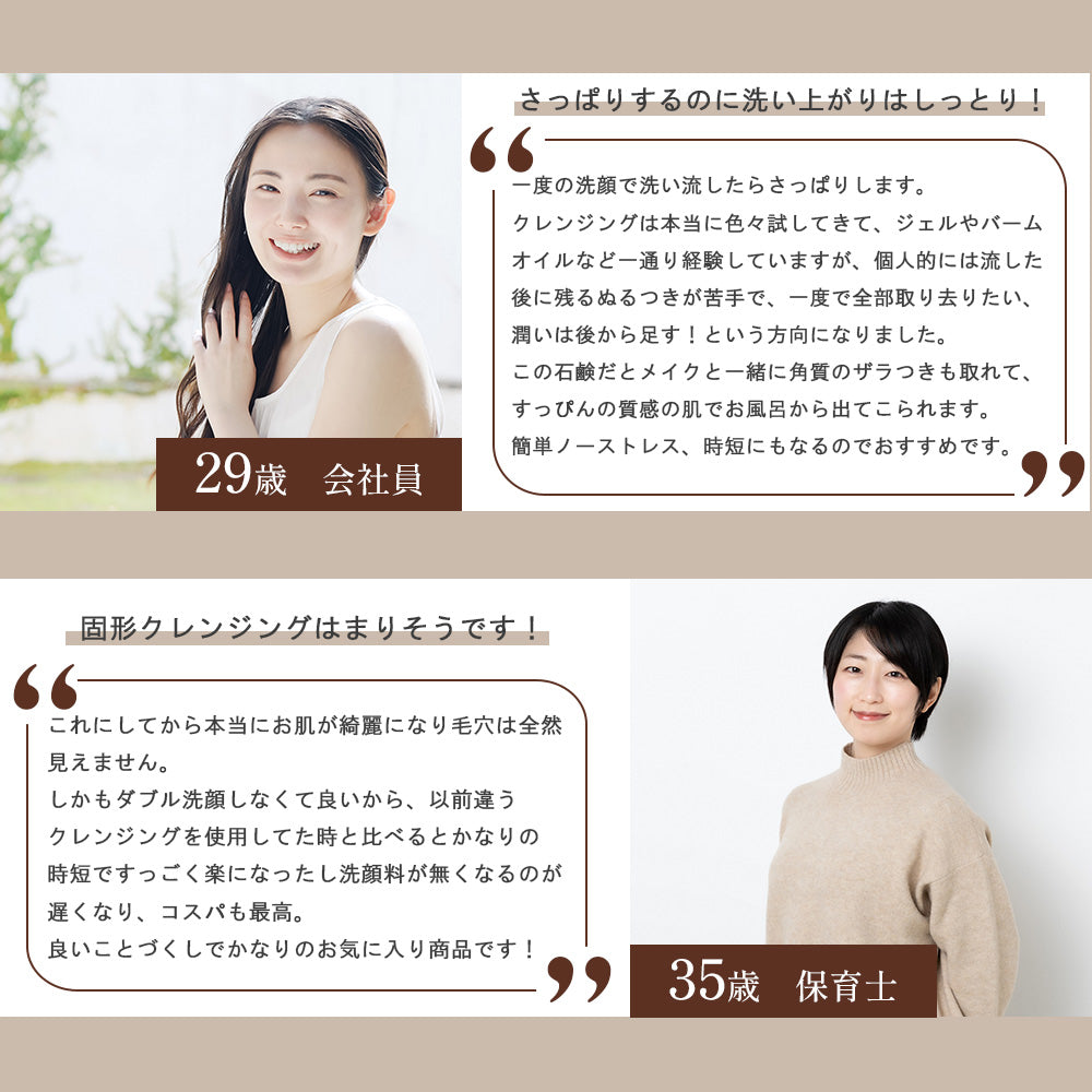 | 成分 | 石鹸素地(純石けん分100%)、カカオ脂、水、ヒマシ油、ガルシニアインディカ種子油、(カブリリル/カブリル)グルコシド、シア脂、カオリン |